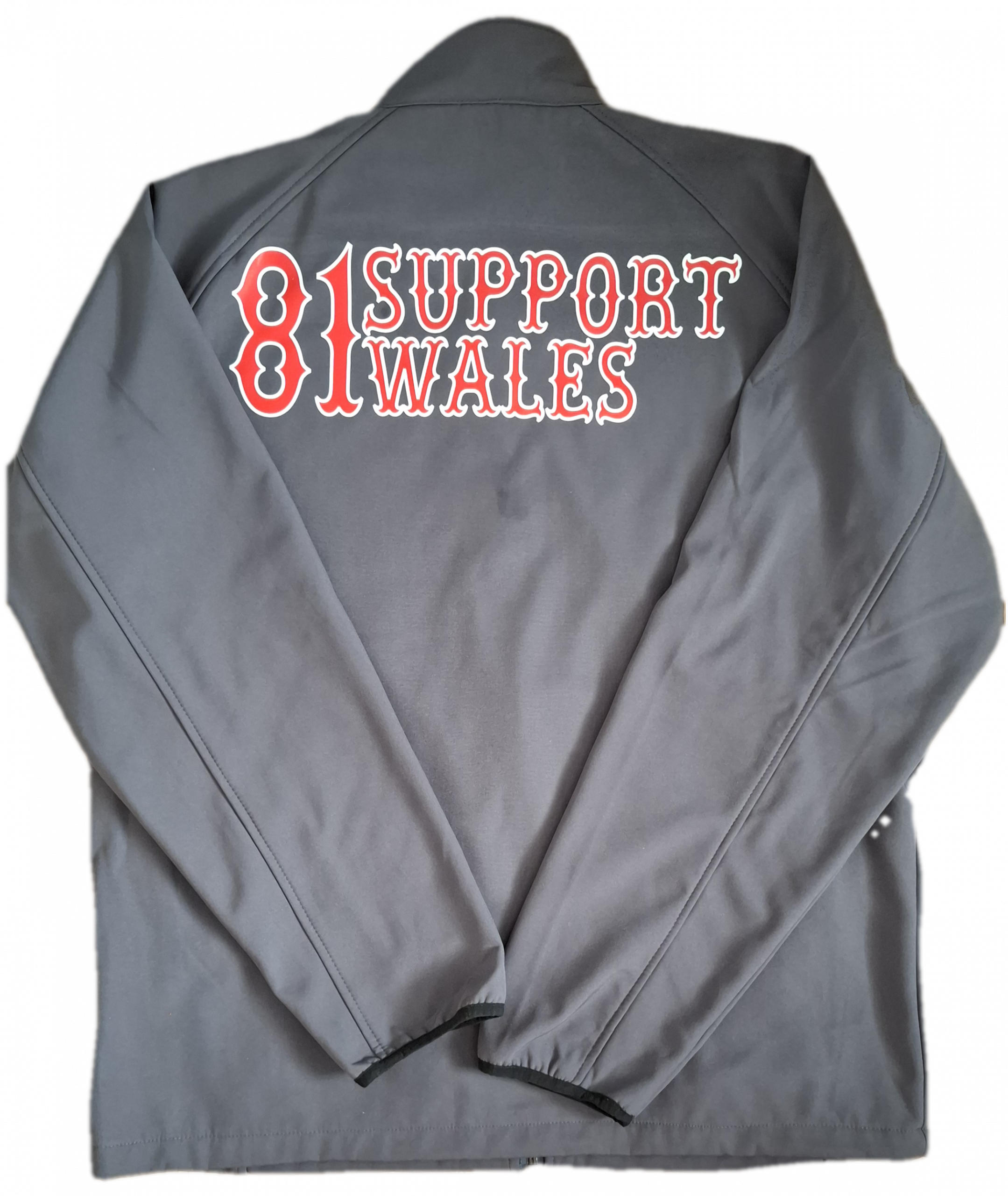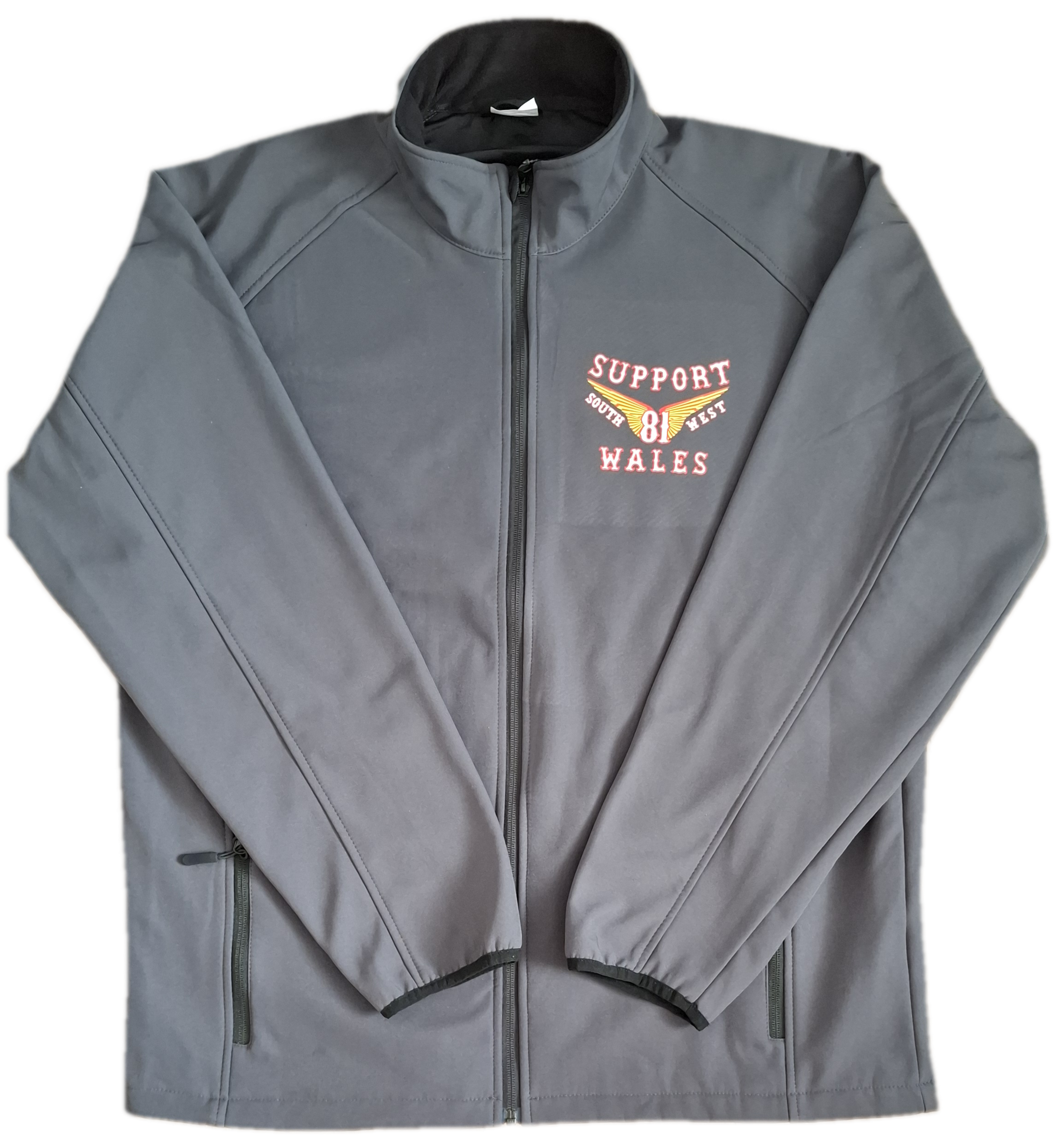 Quality hard-wearing Support 81 softshell jacket, with Support 81 South West graphic on the front, and back